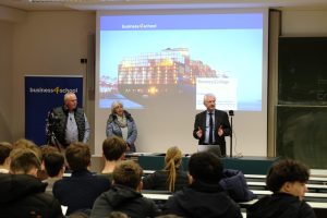 Stefan Schröder erläuterte die zentrale Bedeutung der Logistik für funktionierende internationale Handelsstrukturen. Sie sorgt dafür, dass Waren zur richtigen Zeit am richtigen Ort und in der richtigen Menge verfügbar sind. Die Schülerinnen und Schüler erhielten Einblicke in die Komplexität moderner Lieferketten und lernten, wie verschiedene Transportwege und logistische Prozesse zusammenwirken, um weltweite Warenströme zu ermöglichen.