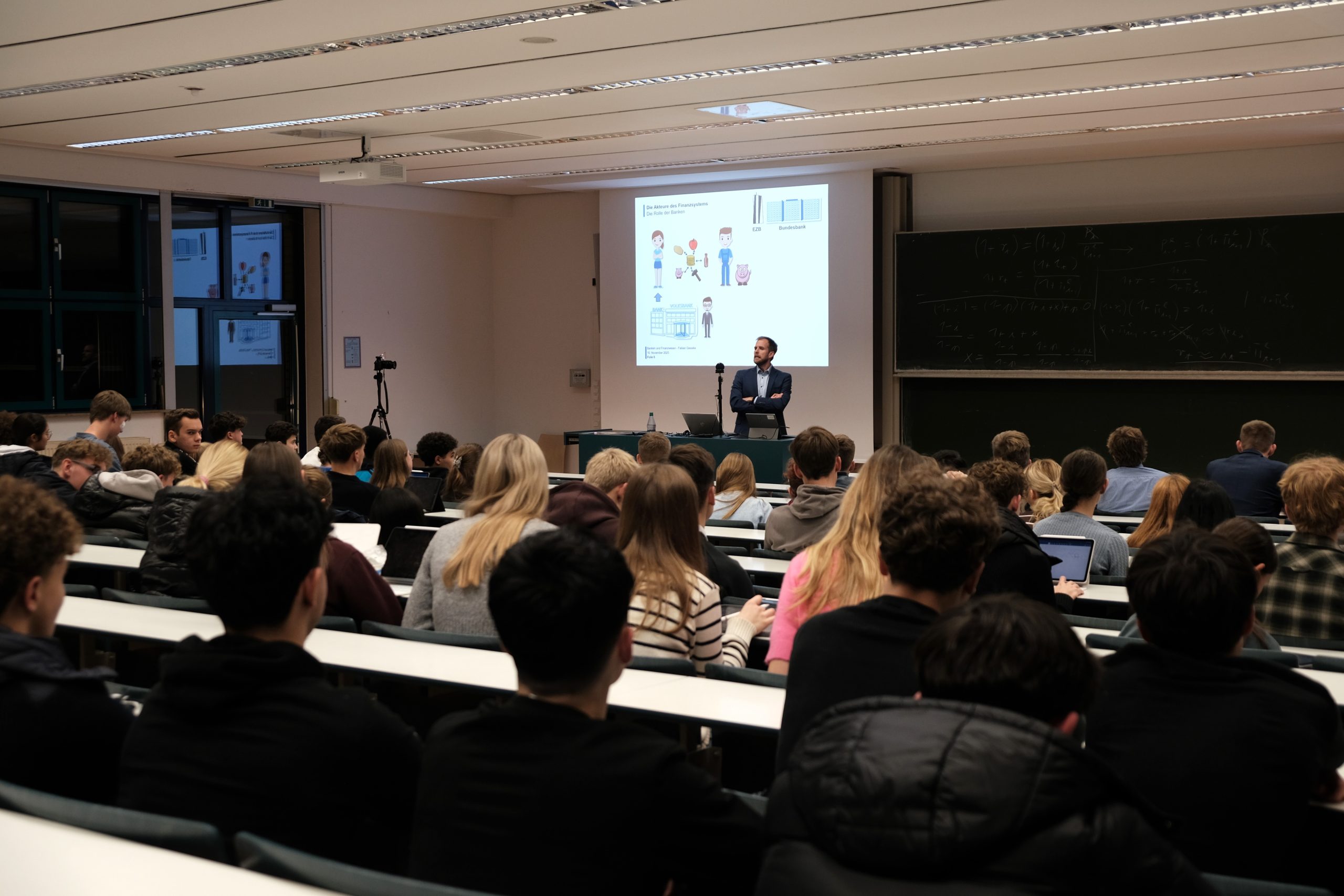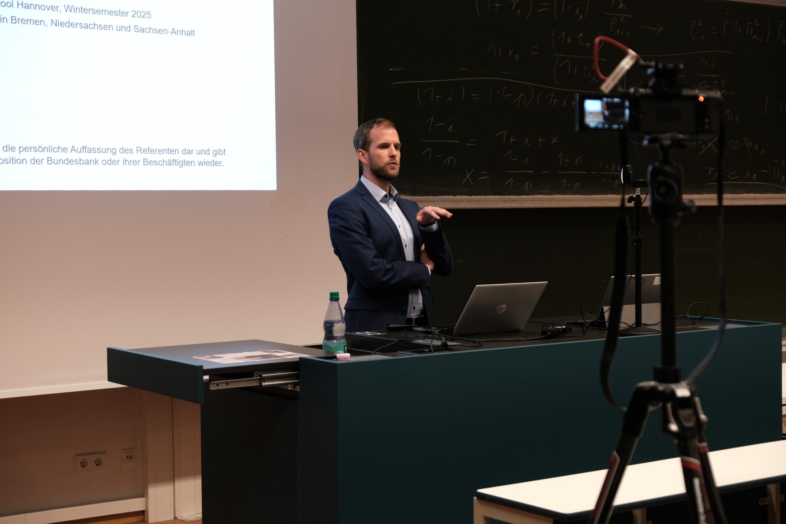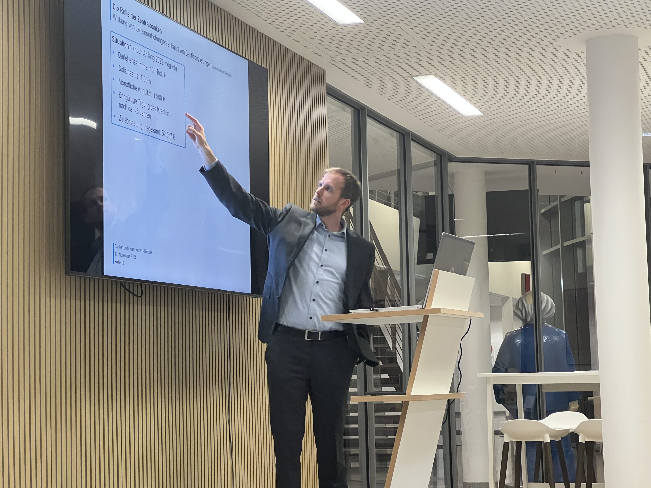 Fabian Gieseke erläuterte die Aufgaben der Deutschen Bundesbank im Eurosystem, von der Bargeldversorgung und Fälschungskontrolle über die Bankenaufsicht bis zur Geldpolitik im Rahmen der Europäischen Zentralbank. Dabei wurde deutlich, wie wichtig Preisstabilität und Zinssteuerung für eine funktionierende Wirtschaft sind.