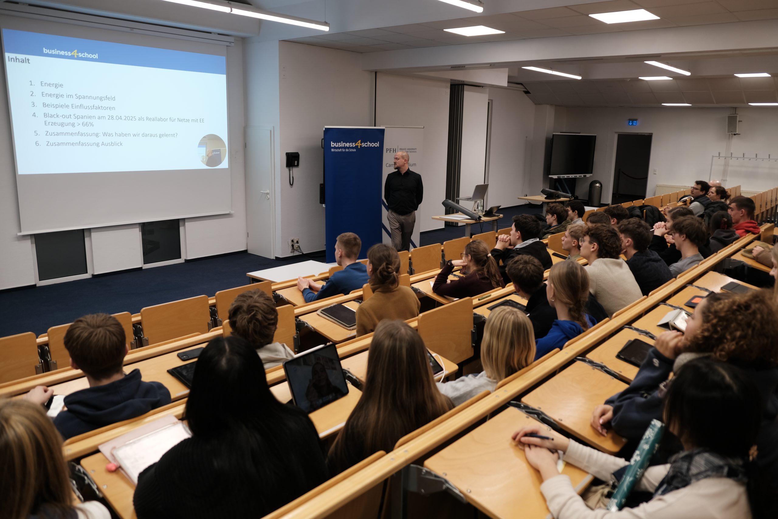 Abschließend nutzten viele Schülerinnen und Schüler die Gelegenheit zum direkten Austausch mit dem Dozenten. Das Fazit des Abends war eindeutig: Die Energiewende ist eine der größten gesellschaftlichen Aufgaben unserer Zeit: Sie erfordert technisches Know-how, wirtschaftliches Verständnis und verantwortungsbewusste politische Entscheidungen.