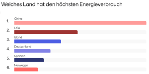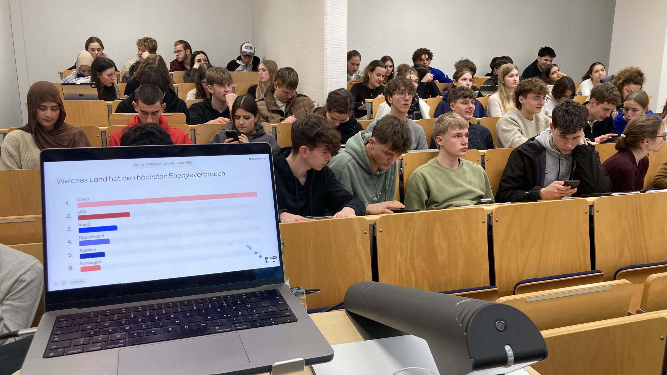 Spannend war auch die interaktive Mentimeter-Umfrage, an der die Schülerinnen und Schüler aktiv teilnahmen. Bei der Frage „Welches Land hat den höchsten Energieverbrauch?“ schätzten die Schülerinnen und Schüler korrekt ein: China auf Platz 1 und die USA auf Platz 2, während europäische Länder wie Norwegen und Spanien die unteren Plätze belegten.