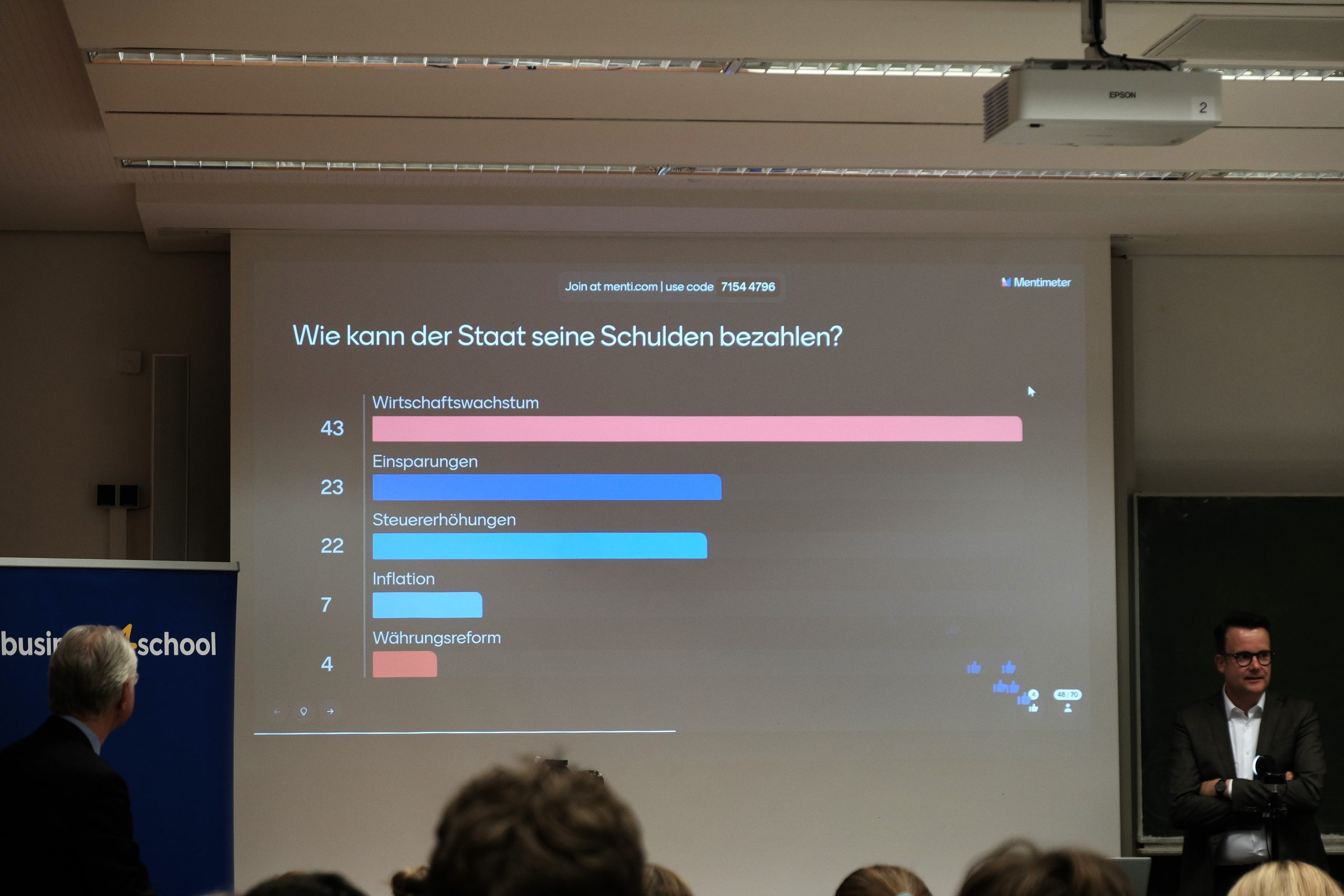 Im Rahmen einer QR-Code-Umfrage durften die Schülerinnen und Schüler in Hannover die Frage Wie kann der Staat seine Schulden bezahlen? beantworten. Dabei stimmten 43 % für Wirtschaftswachstum, 23 % bevorzugten Einsparungen, 22 % wählten Steuererhöhungen aus, 7 % stimmten für die Inflation und 4 % für eine Währungsreform.