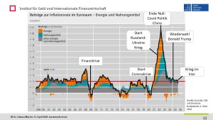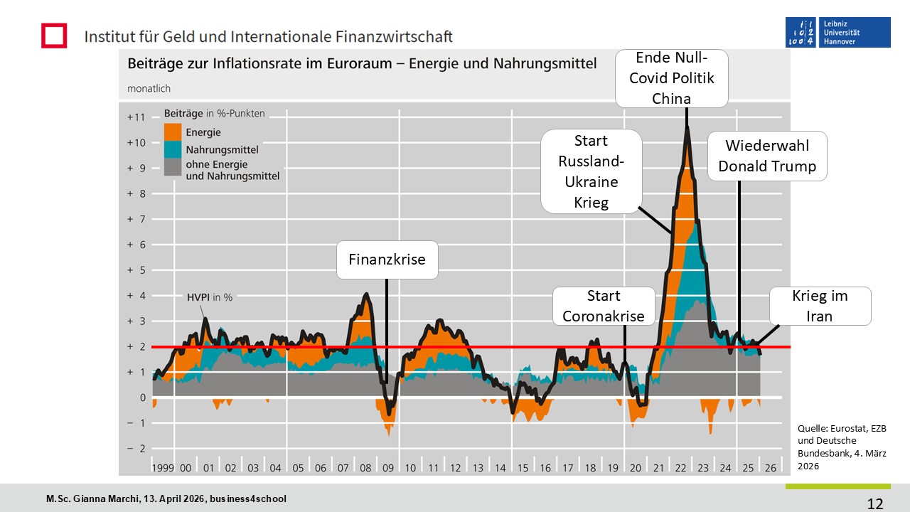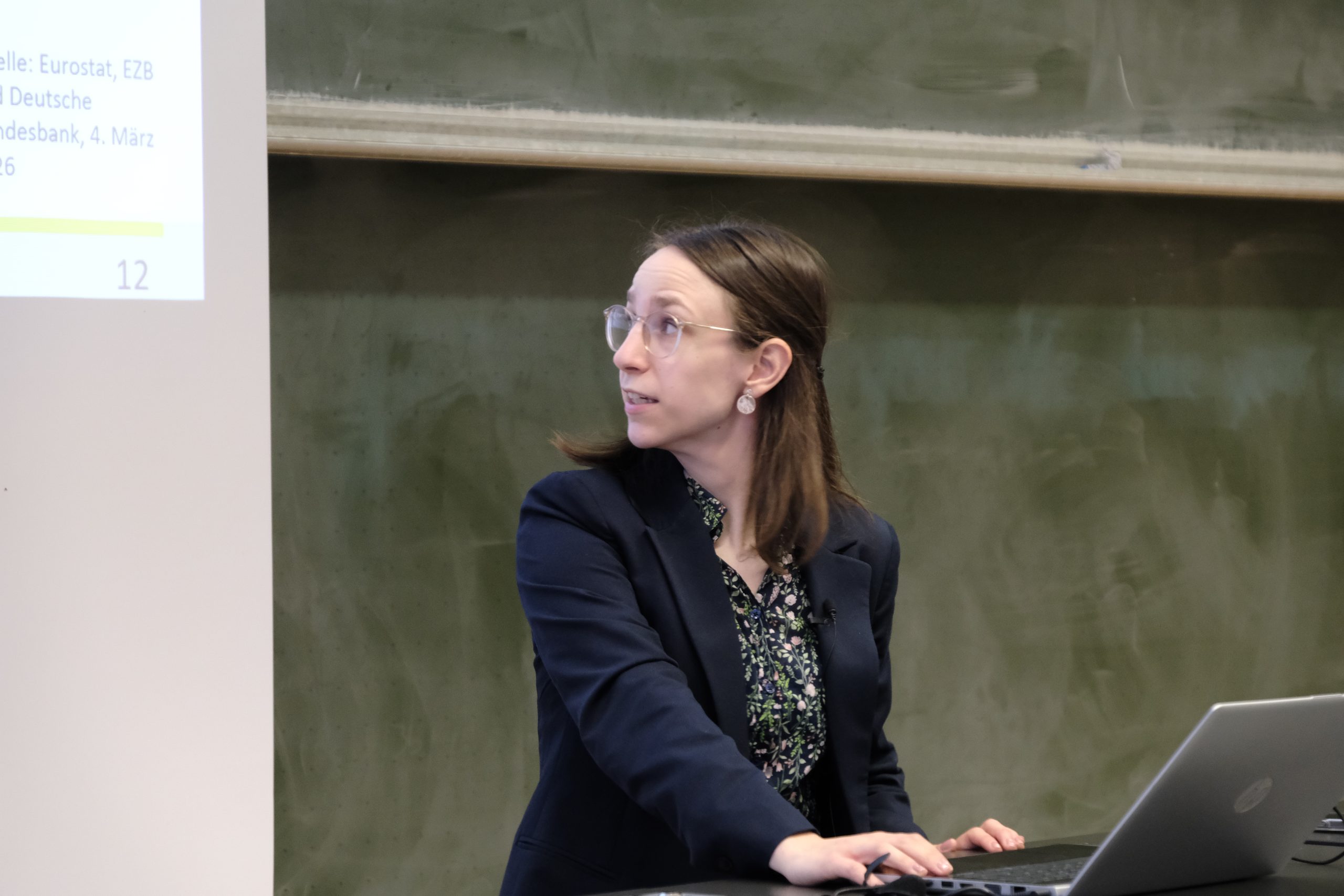 Zunächst gab Gianna Marchi, Wissenschaftliche Mitarbeiterin am Institut für Geld und Internationale Finanzwirtschaft der Leibniz Universität Hannover, einen interaktiven Einblick in das Thema Inflation und Inflationserwartungen. Inflation ist ein anhaltender Prozess der Geldentwertung, der sich in steigenden Preisen und sinkender Kaufkraft widerspiegelt. Besonders anschaulich wurde dies am Beispiel: 100 EUR aus dem Jahr 2016 entsprechen heute nur noch etwa 78 EUR realer Kaufkraft. Dazu machte Gianna Marchi deutlich, welche Rolle die Europäische Zentralbank spielt und warum eine Inflationsrate von etwa 2 % als Zielwert gilt: nicht zuletzt, um Deflation zu vermeiden und wirtschaftliche Stabilität zu sichern. Auch das sogenannte „Unholy Trinity“ zeigte die Zielkonflikte zwischen Wechselkursstabilität, Kapitalmobilität und unabhängiger Geldpolitik.