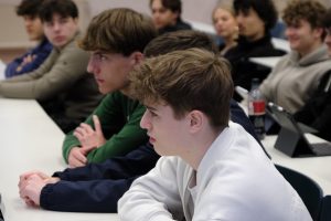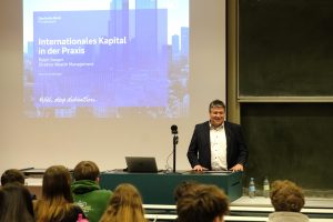 Schließlich zeigte Ralph Seeger, Direktor im Wealth Management der Deutschen Bank, aus seiner Praxis ein Bild der Bewegungen internationaler Kapitalmärkte. Anhand aktueller geopolitischer Entwicklungen, etwa der Konflikte im Nahen Osten, konnten die Schülerinnen und Schüler nachvollziehen, wie sensibel Kapitalströme auf Unsicherheiten reagieren. Die Schülerinnen und Schüler haben herausgearbeitet, dass Kapital in Krisenzeiten häufig aus risikoreicheren Anlagen wie Aktien abgezogen und verstärkt in sichere oder liquide Anlagen umgeschichtet wird. Das zeigte auch, welche Rolle Staaten und Zentralbanken bei der Stabilisierung der Märkte spielen und wie eng globale Ereignisse mit wirtschaftlichen Entwicklungen verknüpft sind.